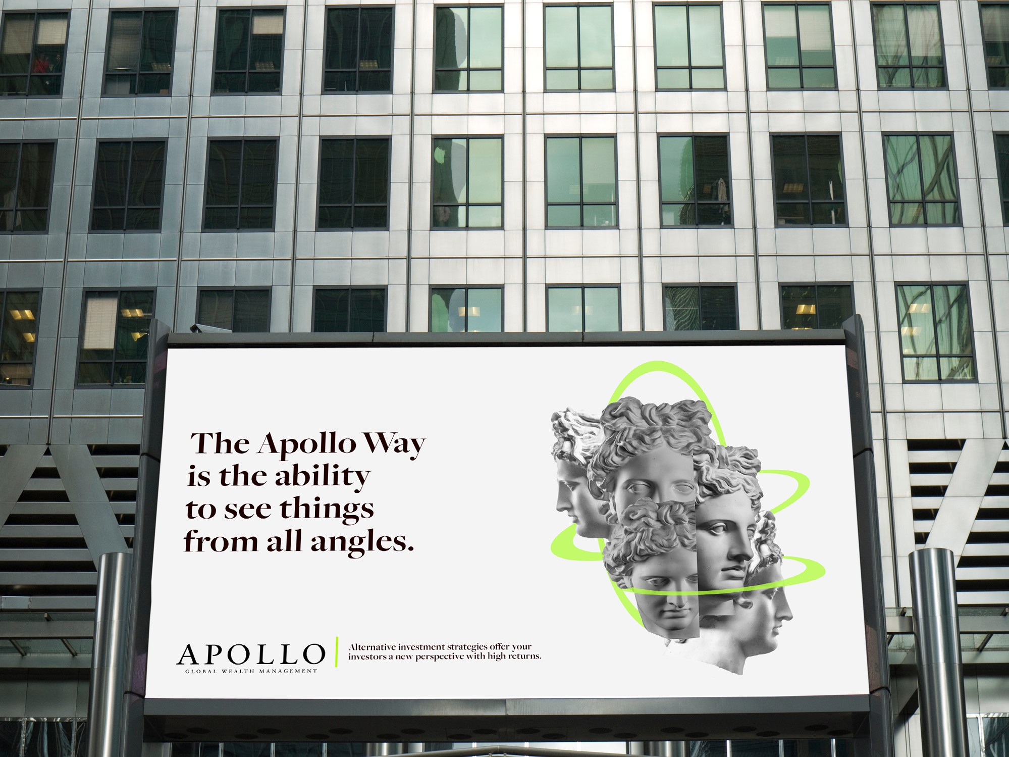 Apollo Global Management looked at our creative team to rebrand and create larger than life advertisements to promote their business. The inspiration came from the Greek god “Apollo” and using different uses of the Greek sculpture heads.